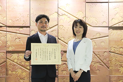 ▲広島県庁での認定式の様子(左:下井 朋正社員、右:横田 美香副知事)